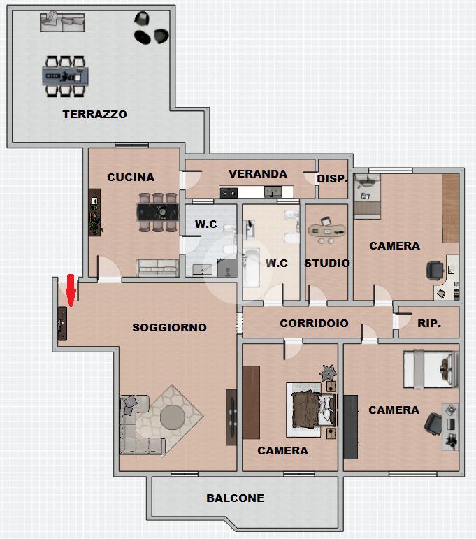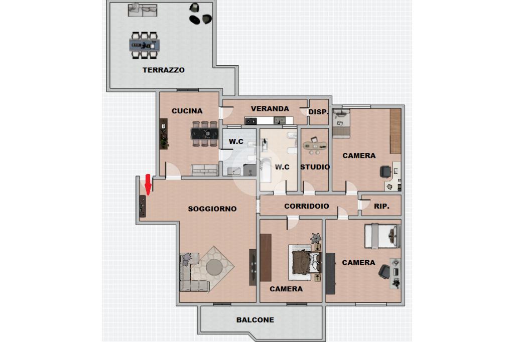 Alla sinistra dell'ingresso si sviluppa la cucina, spaziosa e moderna, comunica con un comodo bagno di servizio e con un pratico balcone verandato che ospita il piano cottura e una dispensa strategica. Ma la vera perla è l'accesso diretto al terrazzo: uno spazio privato e silenzioso dove organizzare cene all'aperto, creare un angolo verde o lasciar giocare i bambini in totale sicurezza.